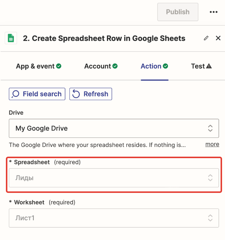 In the field «Spreadsheet» choose the spreadsheet where you plan to collect leads.