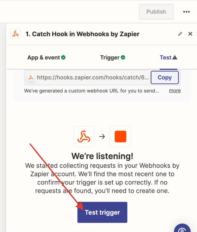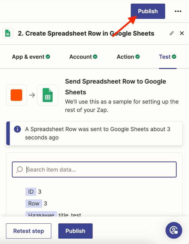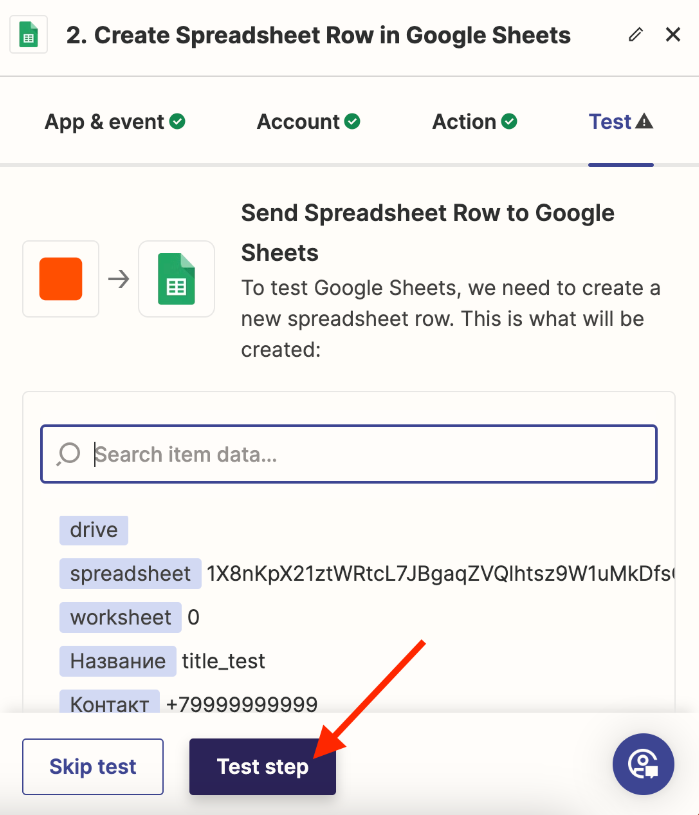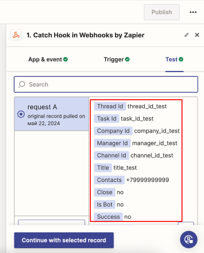 Return to Zapier and check the trigger — click «Test trigger».