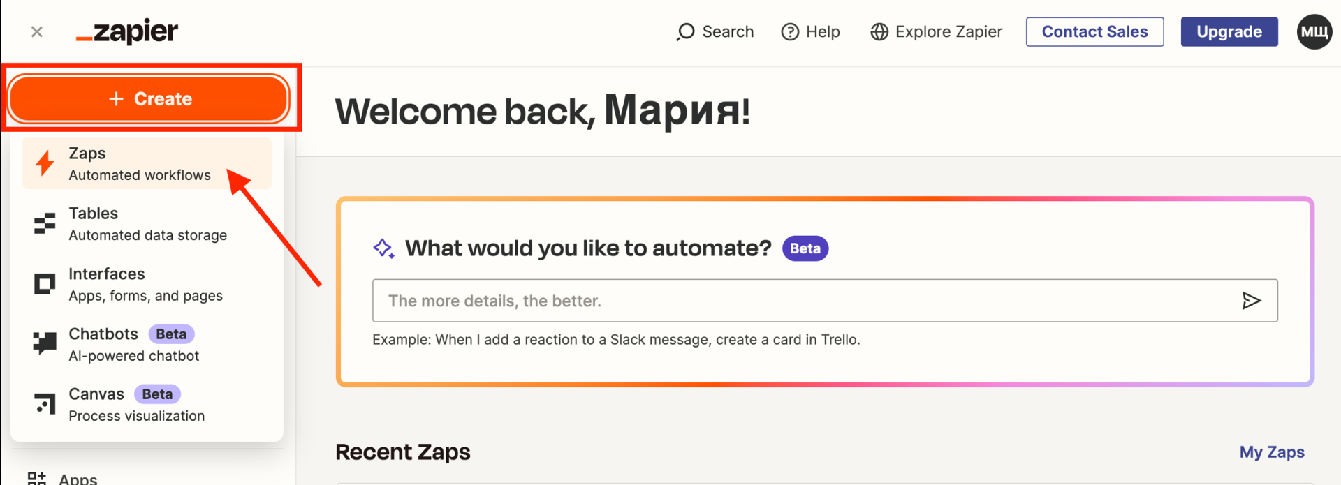 Register in the Zapier service. On the main page select «Create» and click the «Zaps».