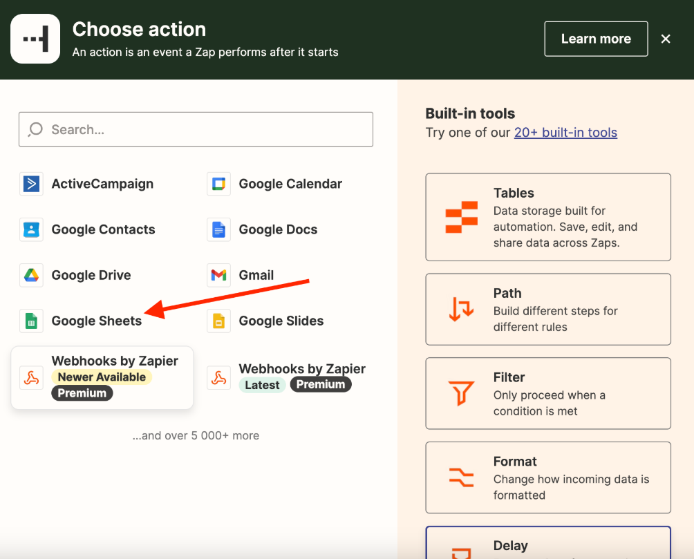 In the menu select «Google Sheets».