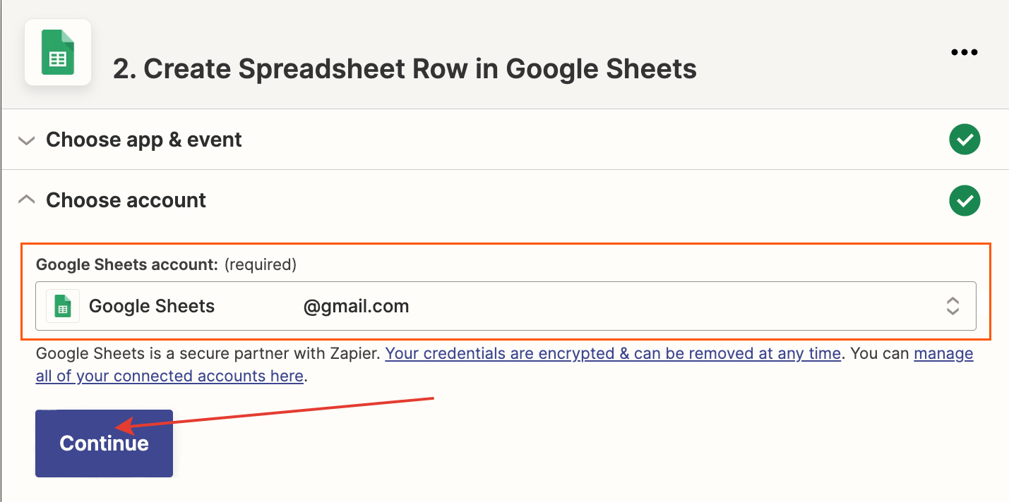 Select the values you want to pass to the spreadsheet and click «Continue».