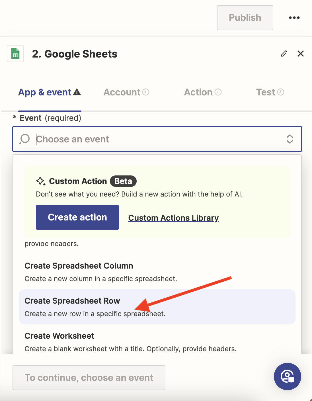 Then select the action «Create Spreadsheet Row» — adding a new row to the spreadsheet.