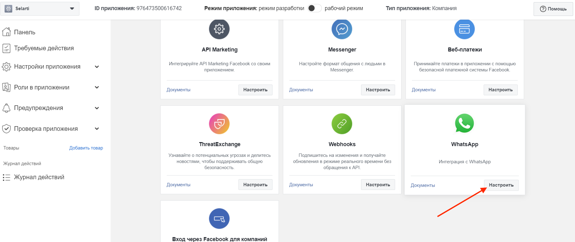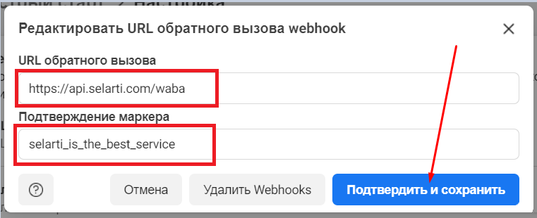 In the «Callback URL» field, paste the link: https://api.selarti.com/waba.