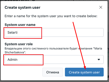 Enter the system user's name, select the role from the drop-down list «Admin» section and click «Create system user».