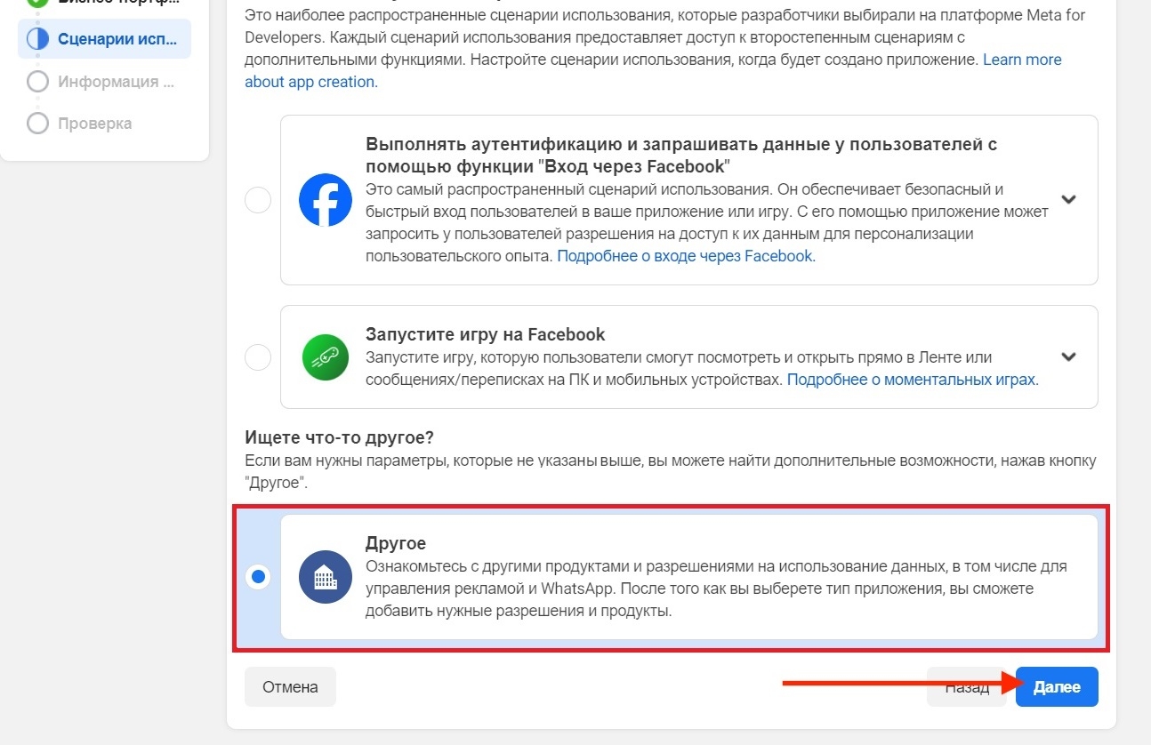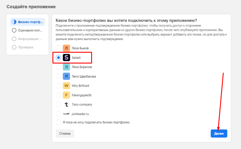 Go to the page. Select the business portfolio you want to connect the application to, click «Next».