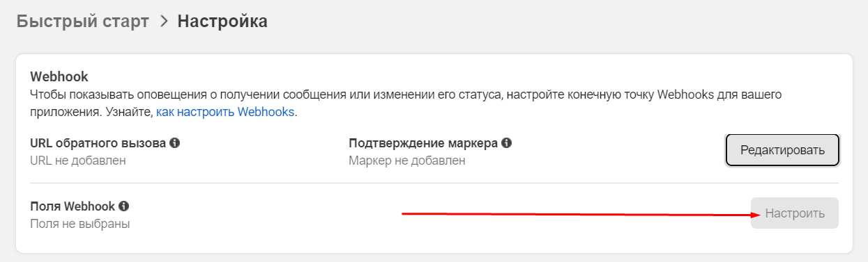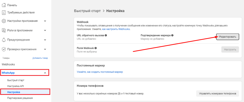 On the left, go to WhatsApp > Setup. In the «Webhook» section, click «Edit».