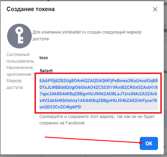 A window with the token will open. Copy it and click «OK».
