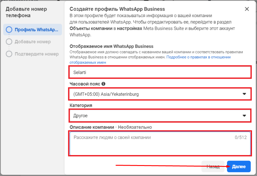 To add a number, enter the display name, select the time zone and category, optionally add a company description, then click «Next».