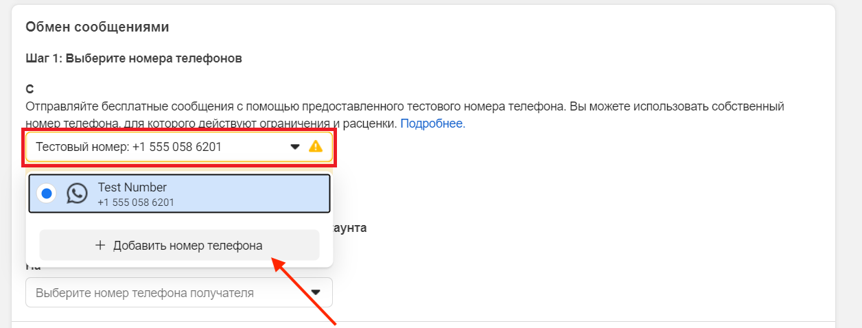 In the opened settings, in the «Messaging»section, click the drop-down list with numbers and select «+ Add phone number».