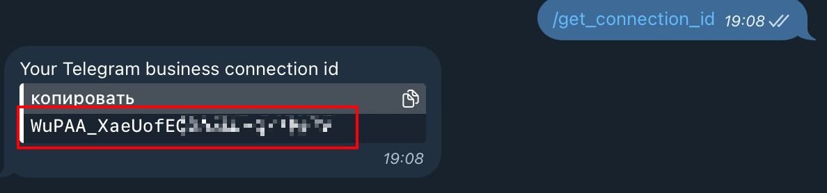 From the configurable Telegram account send the command /get_connection_id to the @selarti_bot and copy the obtained id.