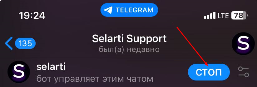 To stop or start the bot, open the Telegram app, find the desired chat and click the button «STOP» or «START» for the corresponding action.