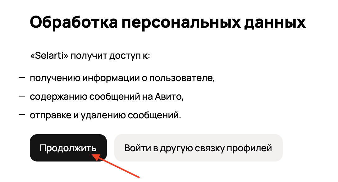 In the opened window provide access to your Avito account using the button «Continue».