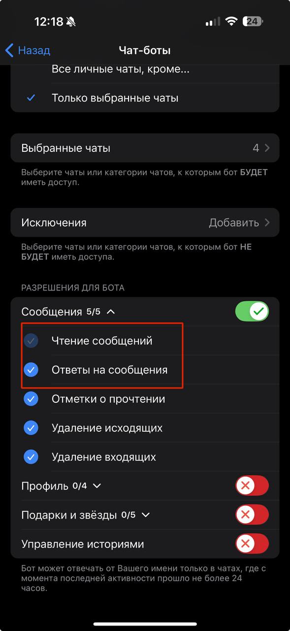 Convenient bot management through the Telegram app interface — you can selectively start or pause the bot in dialogs.