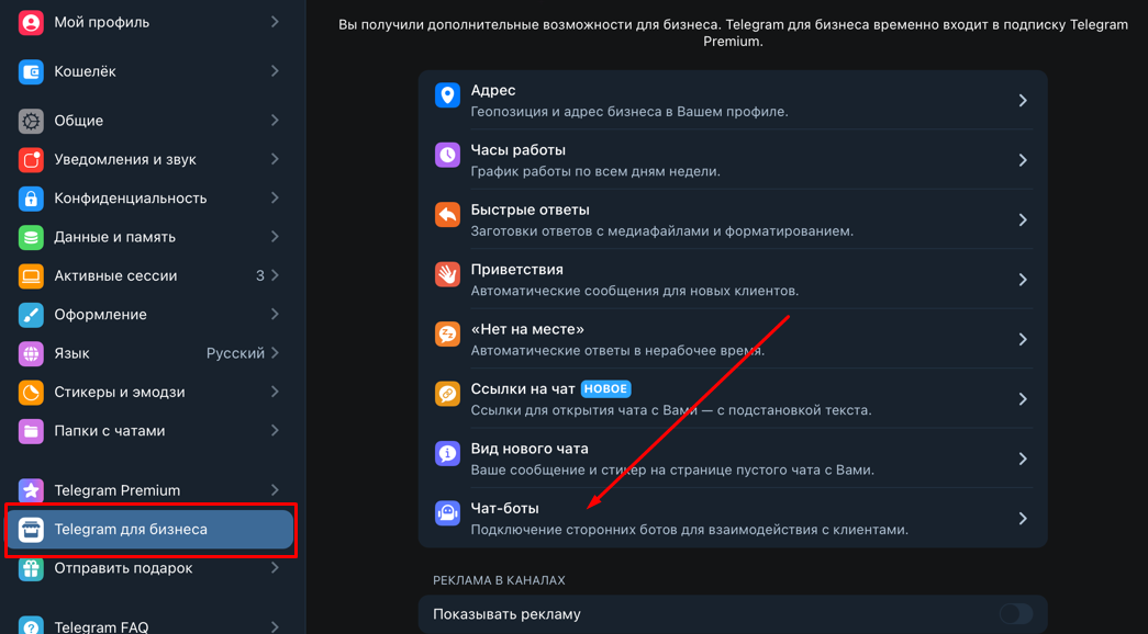 Open Telegram settings, select Telegram for business > Chat bots .