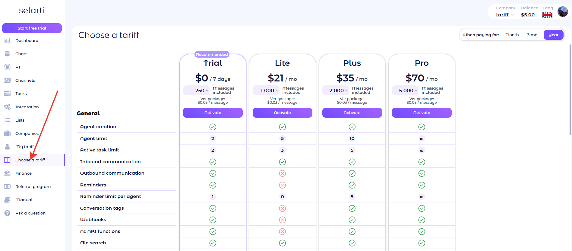 Plans differ by feature set, limits, and message volume. More details in the article [«Plan and limit»](https://manual.selarti.com/manual-en/financial-matters/plans-and-limits).